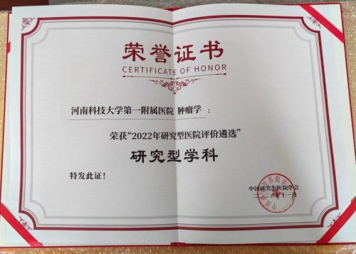 近日,2022中国研究型医院高峰论坛在北京举行,会上发布了2022年中国研究型医院评价遴选结果。河南科技大学第一附属医院(以下简称河科大一附院)肿瘤学从全国521个申报学科中脱颖而出,成功入选“研究型学科”;肿瘤内科七、八病区副主任贾瑞诺在全国1002名申报专家中崭露头角,入选“研究型人才”。
